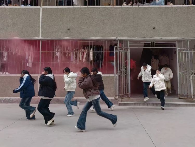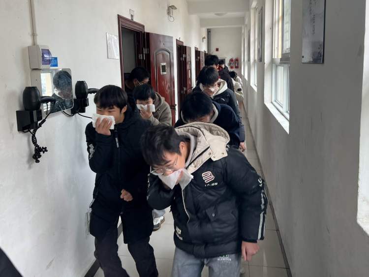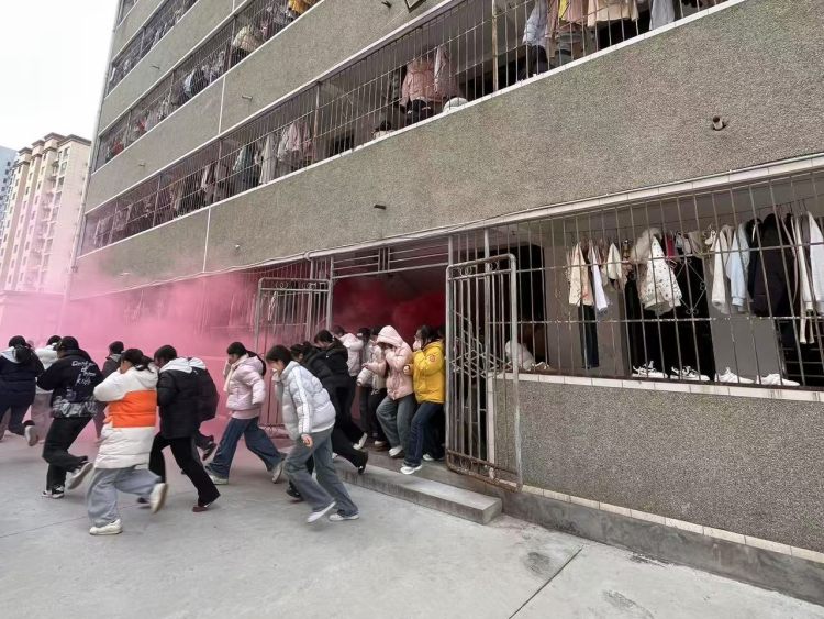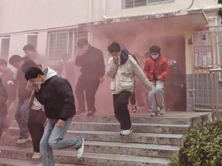 14时50分,随着总指挥指令下达,演练正式启动。宿舍区各指定区域释放模拟烟雾,消防警报准时响起,广播系统循环播报疏散指令,教官同步吹响紧急哨音。接到指令后,住宿生反应迅速、行动有序,不洗漱换装、不携带任何物品,快速穿好鞋子,以湿毛巾捂住口鼻,在寝室长的组织下,严格遵循“统一指挥、分层分区、靠右下行、不推不搡”原则,保持低姿弯腰姿态,沿墙壁和扶手快速撤离宿舍。