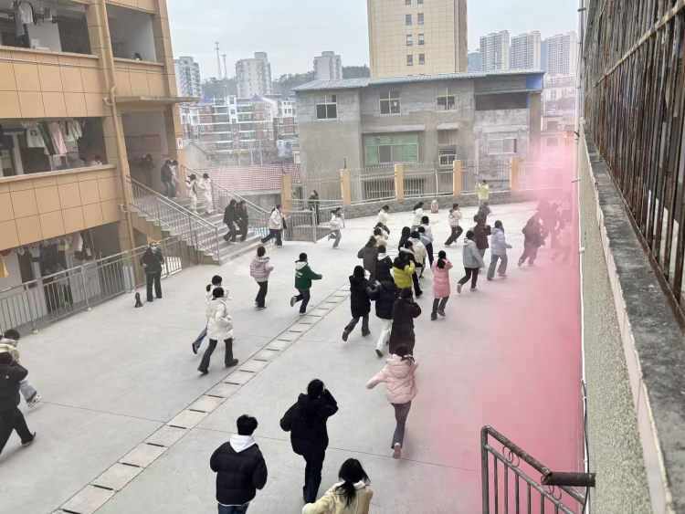 疏散过程中,班主任、教官及宿管员在楼梯口、拐角处等关键节点全程值守引导,反复喊话提醒“不要慌、低头捂鼻、靠右行进、注意脚下”,及时处置各类突发情况,坚决防范拥挤踩踏事故发生。各楼层工作人员在主要人流疏散完毕后,迅速对宿舍房间、卫生间等区域进行全面排查,确保无一名学生滞留。14时54分,全体学生顺利抵达运动场指定集合区域,按班级快速列队,班长即刻清点人数并上报,各连队长汇总后向现场指挥中心汇报,整个疏散过程高效顺畅,仅用时4分钟。